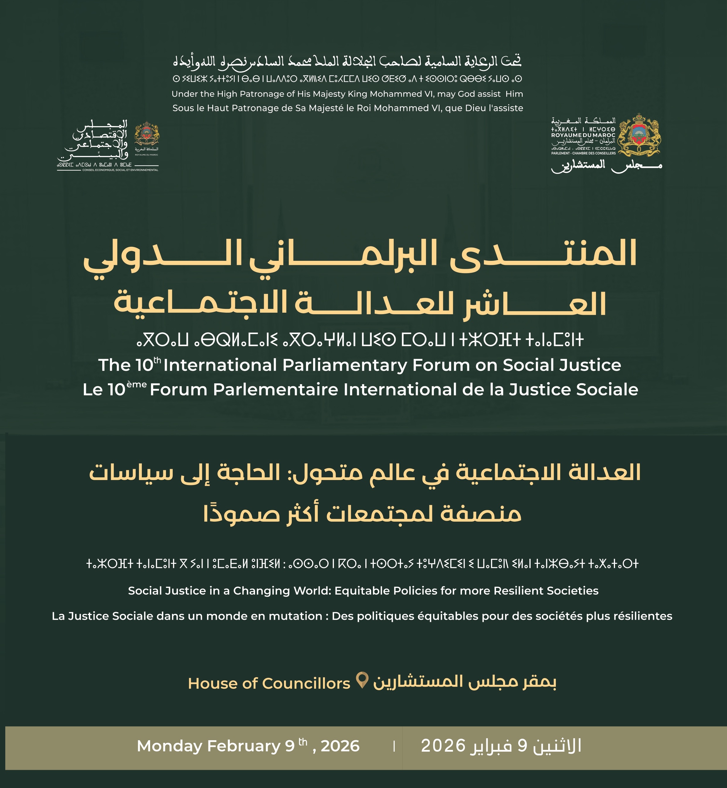 تحت الرعاية السامية لصاحب الجلالة الملك محمد السادس نصره الله، ينظم مجلس المستشارين، بشراكة مع المجلس الاقتصادي والاجتماعي والبيئي، يوم الإثنين 9 فبراير 2026، فعاليات المنتدى البرلماني الدولي العاشر للعدالة الاجتماعية، تحت شعار:
